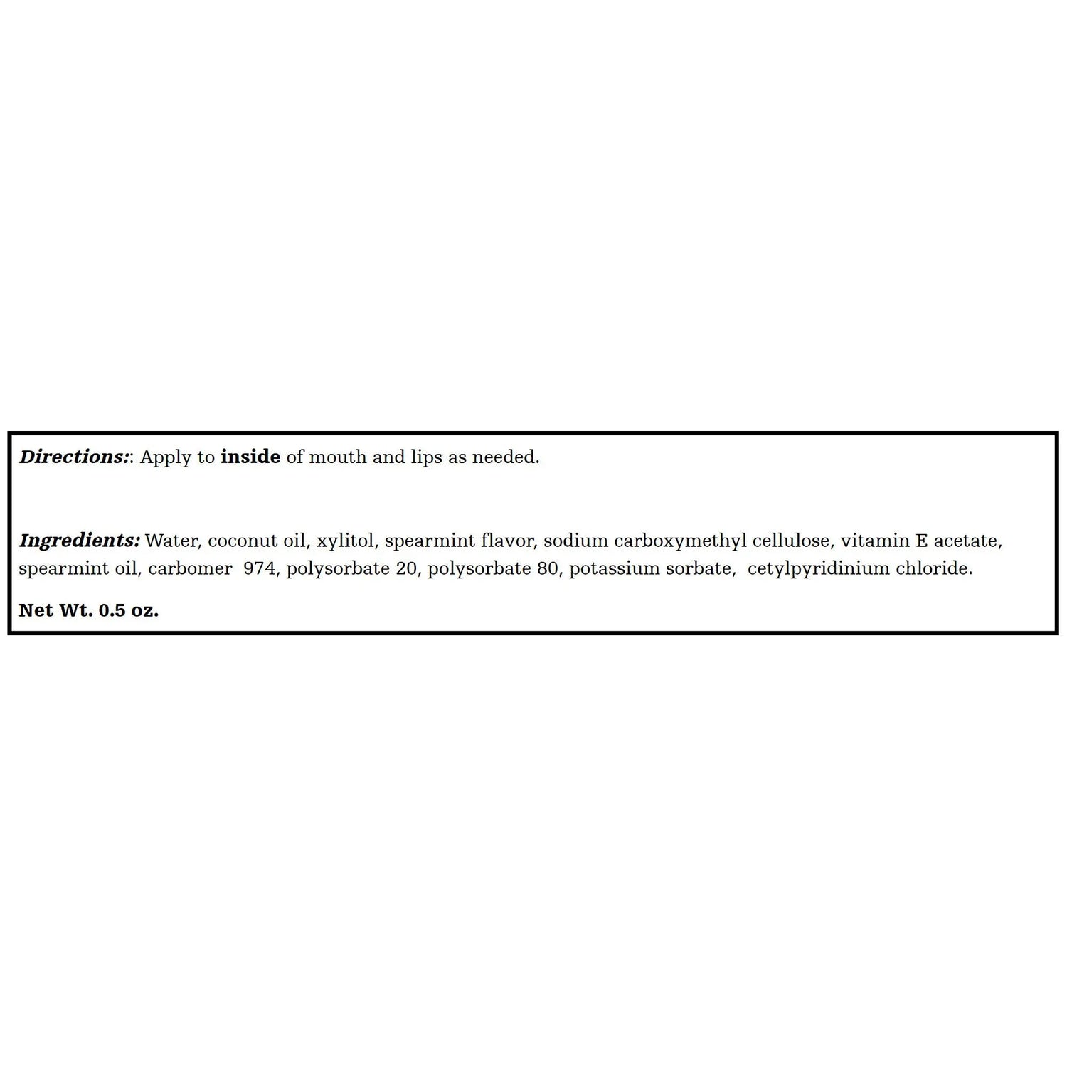 • 0.5 oz. squeeze tubeWater-based formula contains vitamin E and coconut oil to hydrate your lips and mouth